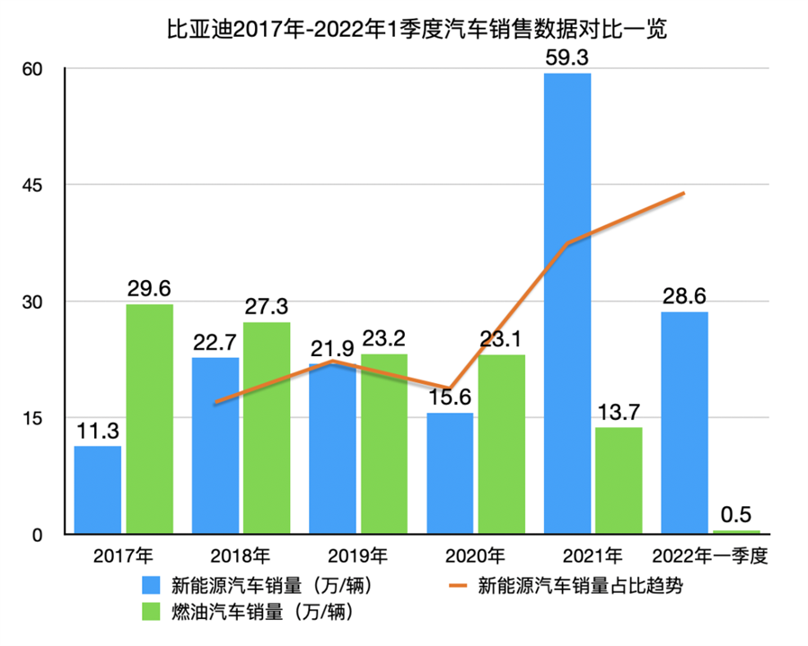 進(jìn)入2022年,燃油車在比亞迪整體汽車業(yè)務(wù)中的占比繼續(xù)降低。2022年4月3日,比亞迪公布的產(chǎn)銷數(shù)據(jù)顯示,一季度燃油車銷量為0.5萬輛,同比下滑89.78%,在整體銷量中占比僅1.73%;新能源汽車銷量為28.63萬輛,同比大增423%。