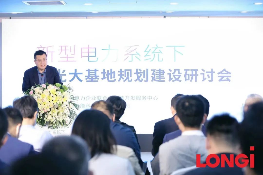 中電聯(lián)電力評價咨詢院院長蔡義清、國家發(fā)改委能源研究所可再生能源中心研究員時璟麗、國家電網(wǎng)能源研究院新能源與統(tǒng)計研究所所長李瓊慧、中國電科院新能源中心總工程師遲永寧和隆基股份總裁李振國、中國區(qū)負責人劉玉璽、品牌總經(jīng)理霍焱等參加會議,并就隆基股份對風光大基地建設的思考和舉措,做詳細介紹和熱烈討論。