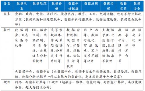 根據(jù)大數(shù)據(jù)行業(yè)生態(tài)參與企業(yè)所提供的產(chǎn)品或服務(wù)類型,可將大數(shù)據(jù)行業(yè)劃分為大數(shù)據(jù)硬件、大數(shù)據(jù)軟件和大數(shù)據(jù)服務(wù);同時根據(jù)大數(shù)據(jù)生命周期業(yè)務(wù)流程,可將大數(shù)據(jù)行業(yè)劃分為數(shù)據(jù)采集、數(shù)據(jù)處理、數(shù)據(jù)存儲、數(shù)據(jù)分析挖掘、數(shù)據(jù)應(yīng)用、數(shù)據(jù)治理、數(shù)據(jù)交易和數(shù)據(jù)安全等主要業(yè)務(wù)環(huán)節(jié),具體如下表所示: