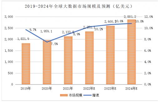 賽迪CCID統(tǒng)計,全球大數(shù)據(jù)市場規(guī)模由2019年的1,821.9億美元增長至2021年的2,133.5億美元,復(fù)合年增長率8.2%,大數(shù)據(jù)市場規(guī)模包含了大數(shù)據(jù)相關(guān)硬件、軟件、服務(wù)市場收入。全球范圍內(nèi)運用大數(shù)據(jù)推動經(jīng)濟發(fā)展、完善社會治理、提升政府服務(wù)和監(jiān)管能力正成為趨勢,未來全球大數(shù)據(jù)市場將保持持續(xù)穩(wěn)定發(fā)展。預(yù)計2024年全球大數(shù)據(jù)市場規(guī)模將達(dá)到2,881.2億美元,未來三年復(fù)合年增長率約為10.7%。