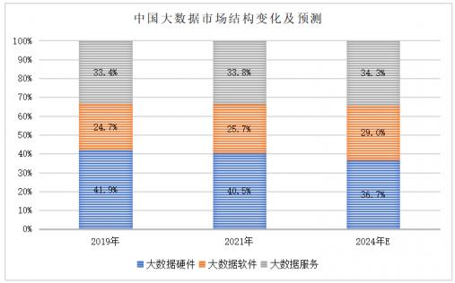 近幾年大數(shù)據(jù)硬件的占比在逐漸下降,大數(shù)據(jù)軟件和大數(shù)據(jù)服務(wù)的占比在逐步提高。未來我國大數(shù)據(jù)軟件和服務(wù)市場相比硬件市場將呈現(xiàn)更好的發(fā)展態(tài)勢。預(yù)計2024年我國大數(shù)據(jù)硬件、大數(shù)據(jù)軟件和大數(shù)據(jù)服務(wù)的占比將分別為36.7%、29.0%和34.3%。