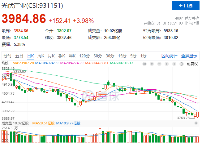 4月18日,近期“跌跌不休”的光伏板塊低開高走,迎來久違普漲行情,中證光伏產(chǎn)業(yè)指數(shù)(CSI:931151)報(bào)收3985點(diǎn),漲幅高達(dá)3.98%,兩市共有近百只光伏概念股上漲,其中設(shè)備、組件、輔材個(gè)股漲幅居前。