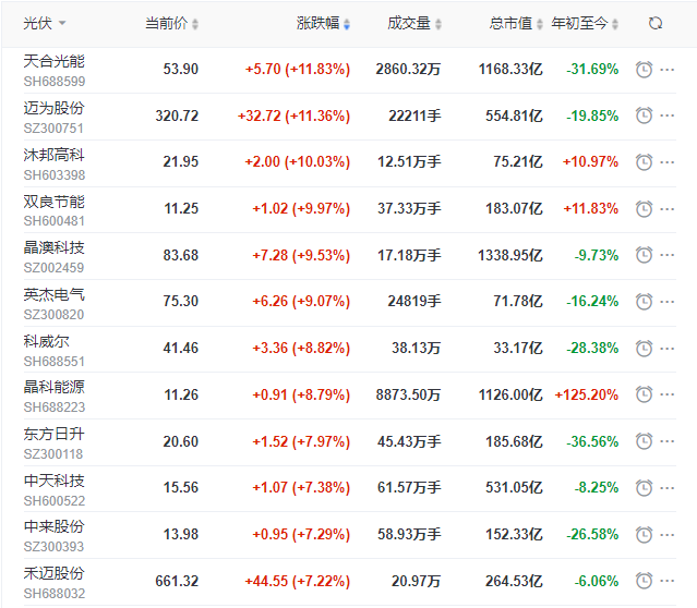 個(gè)股表現(xiàn)上,雙良節(jié)能強(qiáng)勢(shì)漲停,天合光能、邁為股份漲超11%,晶澳科技漲超9%,晶科能源漲超8%,東方日升、中來股份、禾邁股份、帝爾激光等漲超7%,福斯特、錦浪科技、愛旭股份等漲超6%,晶盛機(jī)電、正泰電器、上機(jī)數(shù)控等漲超5%,賽伍技術(shù)、固德威、中信博、通靈股份、隆基股份等漲超4%,陽光電源、高測(cè)股份、奧特維、大全能源、福萊特等漲超3%。