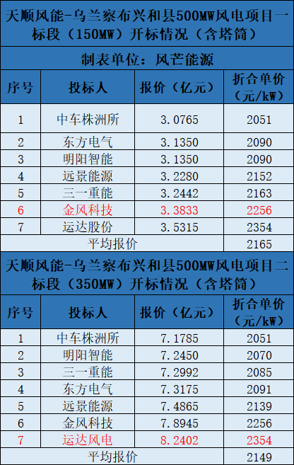 根據(jù)風(fēng)芒能源此前獨(dú)家獲悉的開(kāi)標(biāo)情況,金風(fēng)科技在第一標(biāo)段投標(biāo)報(bào)價(jià)為次高價(jià);運(yùn)達(dá)股份在第二標(biāo)段投標(biāo)報(bào)價(jià)為最高價(jià)。