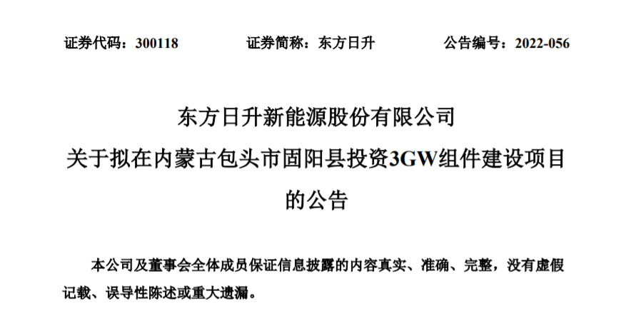 4月22日丨東方日升(300118.SZ)公布,公司第三屆董事會(huì)第三十二次會(huì)議審議通過(guò)了《關(guān)于擬在內(nèi)蒙古包頭市固陽(yáng)縣投資3GW組件建設(shè)項(xiàng)目的議案》。