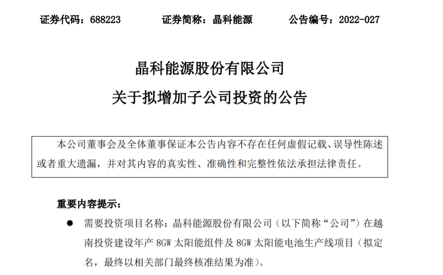 4月22日丨晶科能源(688223.SH)公布,為優(yōu)化公司全球制造產(chǎn)能布局,公司于2021年1月7日召開第一屆董事會(huì)第三次會(huì)議審議通過(guò)了《關(guān)于對(duì)外投資設(shè)立子公司的議案》,同意公司通過(guò)全資子公司晶科能源香港有限公司(“晶科香港”)投資設(shè)立 JINKO SOLAR(VIETNAM) INDUSTRIES COMPANY LIMITED (“晶科越南實(shí)業(yè)”),計(jì)劃在越南總投資約49976萬(wàn)美元(以外匯匯率 6.7 計(jì)算),用于建設(shè)年產(chǎn)5GW高效電池和5GW高效電池組件生產(chǎn)線項(xiàng)目。
