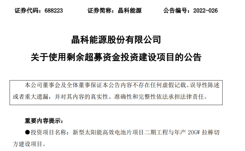 4月22日丨晶科能源(688223.SH)于2022年4月21日召開公司第一屆董事會(huì)第十八次會(huì)議和第一屆監(jiān)事會(huì)第九次會(huì)議,審議通過(guò)了《關(guān)于使用剩余超募資金投資建設(shè)項(xiàng)目的議案》,同意公司使用剩余超募資金投資建設(shè)新型太陽(yáng)能高效電池片項(xiàng)目二期工程與年產(chǎn)20GW拉棒切方建設(shè)項(xiàng)目。