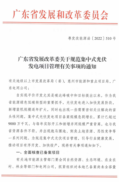 廣東發(fā)改委發(fā)布《關(guān)于規(guī)范集中式光伏發(fā)電項(xiàng)目管理有關(guān)事項(xiàng)的通知》,全面整頓全省光伏。