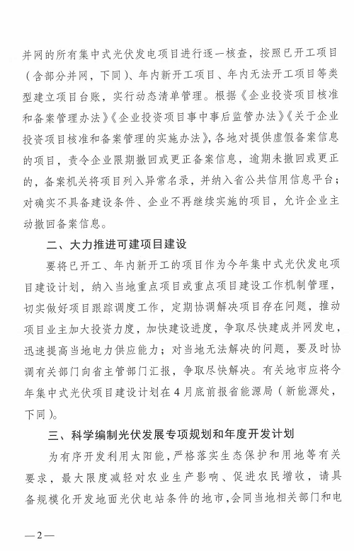 2.大力推進(jìn)可建項(xiàng)目建設(shè):要將已開工、年內(nèi)新開工的項(xiàng)目作為今年集中式光伏發(fā)電項(xiàng)目建設(shè)計(jì)劃,納入當(dāng)?shù)刂攸c(diǎn)項(xiàng)目或重點(diǎn)項(xiàng)目建設(shè)工作機(jī)制管理,