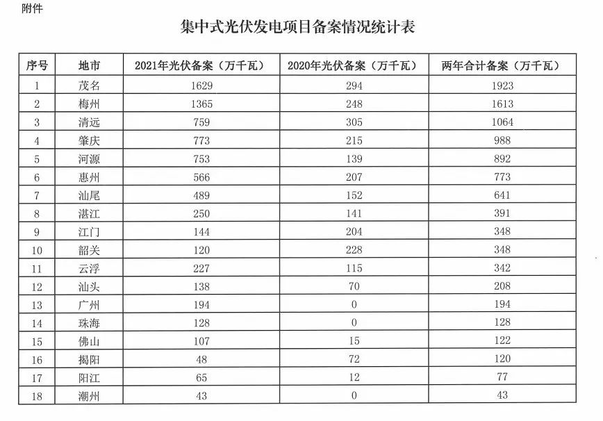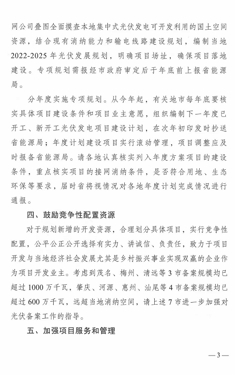 4.鼓勵(lì)競(jìng)爭(zhēng)性配置資源:考慮到茂名、梅州、清遠(yuǎn)等3市備案規(guī)模均已超過1000萬千瓦,肇慶、河源、惠州、汕尾等4市備案規(guī)模均已超過600萬千瓦,遠(yuǎn)超當(dāng)?shù)叵{空間,請(qǐng)上述7市進(jìn)一步加強(qiáng)對(duì)光伏備案工作的指導(dǎo)。