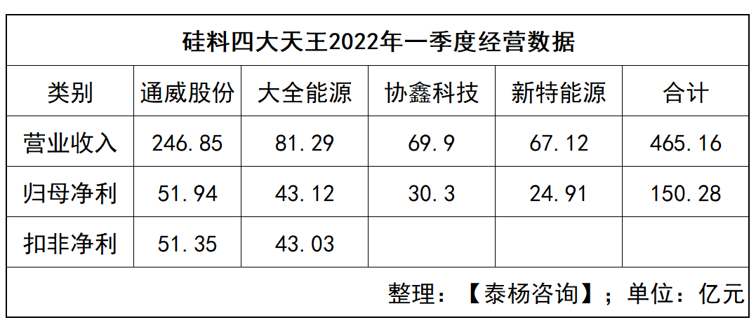 近日硅料“四大天王”通威股份、協(xié)鑫科技、大全能源、新特能源陸續(xù)公布2022年第一季度年度報告,利潤超預期,用實力告訴我們“擁硅為王”。