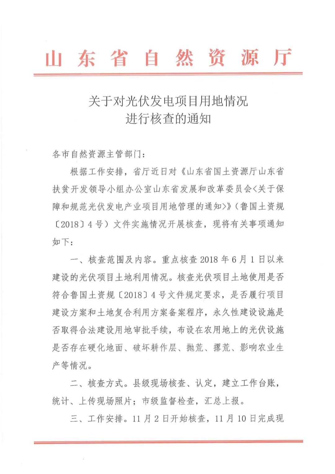 2021年11月2日,山東省自然資源廳下發(fā)《關于對光伏項目用地進行核查的通知》,核查光伏項目土地使用是否符合魯國土資規(guī)〔2018〕4號文件規(guī)定要求,是否履行項目建設方案和土地復合利用方案備案程序,永久性建設設施是否取得合法建設用地審批手續(xù),布設在農用地上的光伏設施是否存在硬化地面、破壞耕作層、拋荒、撂荒、影響農業(yè)生產等情況,并且要求即日起停止光伏項目用地占用耕地的備案工作。
