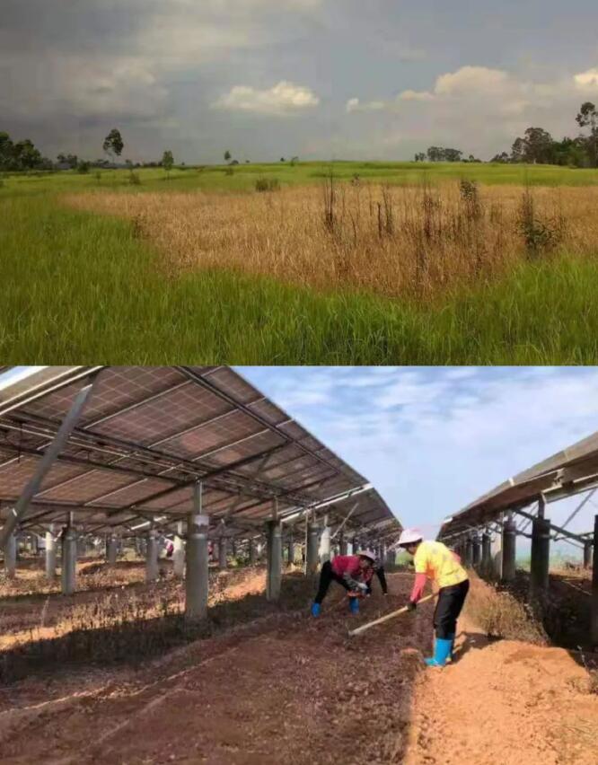 此除了形式上的占用,光伏復合項目的問題還在于土地性質與實際情況是否相符的認定等。一家位于廣東的光伏電站投資商告訴光伏們,下圖中的土地性質雖然為一般農田,但已經(jīng)荒蕪多年,當?shù)剞r民不愿意去進行耕種,“在我們投資建設光伏電站之前,這片土地荒草都有半人高了,光伏電站并網(wǎng)之后,我們在縣供銷社及鎮(zhèn)農資保供的技術指導下,與合作農戶在年前就開始春耕備耕,目前各項種植工作正有序推進,打造真正的生態(tài)農場。”