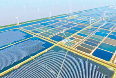 江蘇省南通市如東縣踐行綠色發(fā)展理念,優(yōu)化能源結(jié)構(gòu),大力發(fā)展清潔能源產(chǎn)業(yè),開(kāi)展?jié)O光互補(bǔ)項(xiàng)目,實(shí)現(xiàn)資源的高效綜合利用。圖為位于如東縣的漁光一體互補(bǔ)項(xiàng)目一角。