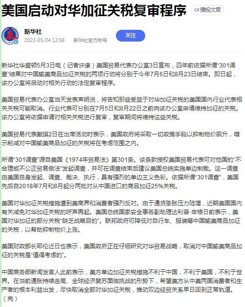 美國301關稅松動,主要迫于國內(nèi)通貨膨脹,物價飆升壓力,據(jù)美國貿(mào)易代表戴琪5月2日在出席活動時表示,美國政府將采取一切政策手段以抑制物價飆升,暗示削減對中國輸美商品加征的關稅將在考慮范圍之內(nèi)。