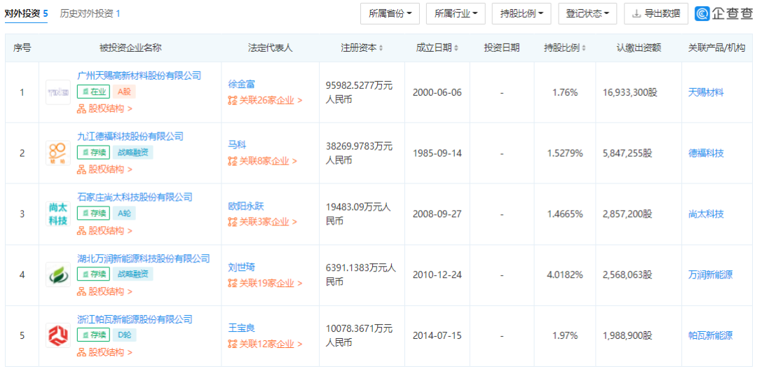 從布局來看,萬向一二三目前對(duì)外5家企業(yè)進(jìn)行投資,分別是天賜材料、德??萍肌⑸刑萍?、萬潤新能源、帕瓦新能源,涉及電解液、銅箔、三元材料、磷酸鐵鋰材料等多個(gè)領(lǐng)域??梢钥吹降氖?,以上企業(yè)均為細(xì)分領(lǐng)域的龍頭企業(yè),萬向一二三已經(jīng)為今后的擴(kuò)產(chǎn)做好材料供應(yīng)的準(zhǔn)備。