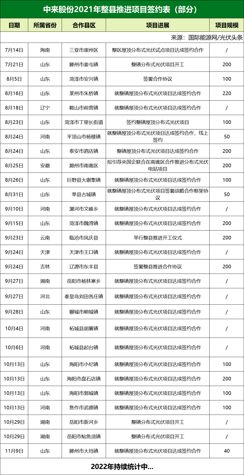 以下是國際能源網(wǎng)/光伏頭條根據(jù)中來股份官方披露資料整理的整縣推進項目部分簽約表: