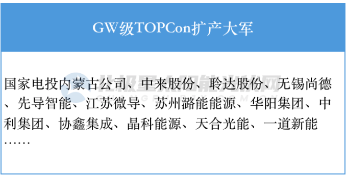 N型TOPCon電池的極限效率為28.7%,高于HJT,且可與現(xiàn)有的PERC產(chǎn)線兼容。領(lǐng)軍擴(kuò)產(chǎn)企業(yè)包括中來股份、一道新能、晶科能源、中利集團(tuán)等。