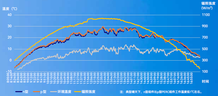 高溫環(huán)境下,結(jié)合優(yōu)異的溫度系數(shù)和較低的工作溫度,n型組件發(fā)電量比p型PERC高2%左右。晶澳聯(lián)合 TÜ V 北德在 CPVT 銀川國(guó)家光伏戶外實(shí)證基地一年期的實(shí)證結(jié)果顯示,典型晴天下,n 型組件比 p型 PERC 組件工作溫度低 1℃左右。