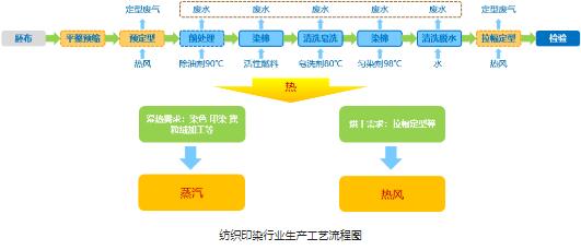 印染是紡織工業(yè)產(chǎn)業(yè)鏈的中間環(huán)節(jié),是通過化學(xué)或物理方法,對(duì)紡織品進(jìn)行處理和染色,是紡織物深加工和提高附加值的關(guān)鍵環(huán)節(jié)。印染的生產(chǎn)工藝中,伴隨著大量的熱(蒸汽、烘干)電需求。原有的供熱裝置因能效低、成本高、環(huán)保壓力大、安全隱患等問題,有較大的升級(jí)改造空間。而且企業(yè)往往也存在電力容量短缺的情況,擴(kuò)容需求迫切。