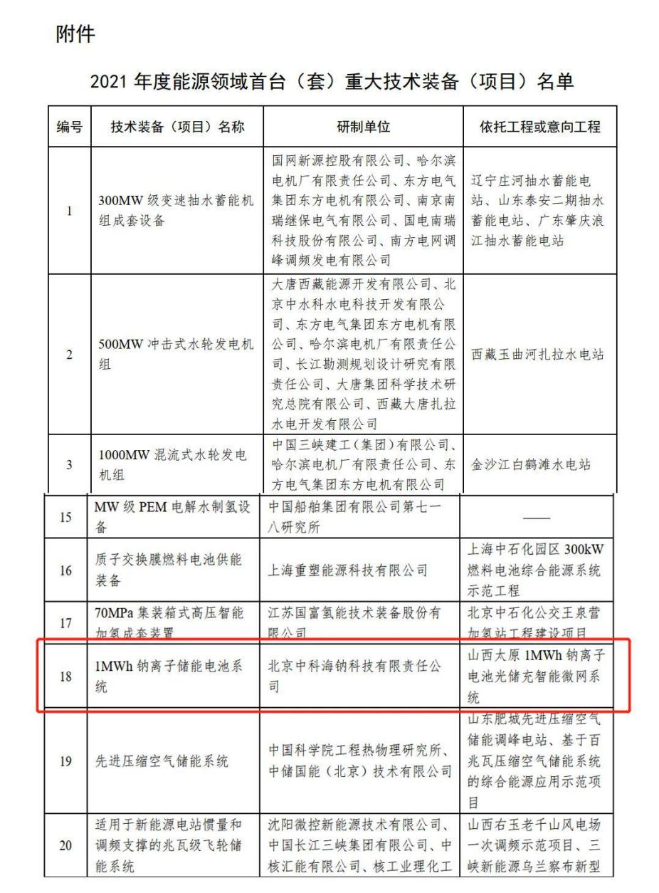 2021年12月,1MWh鈉離子儲能電池系統(tǒng)入選“2021年度能源領域首臺(套)重大技術裝備項目”,這是鈉離子電池相關項目首次入選首臺(套)名單并得到國家能源局官方認可;