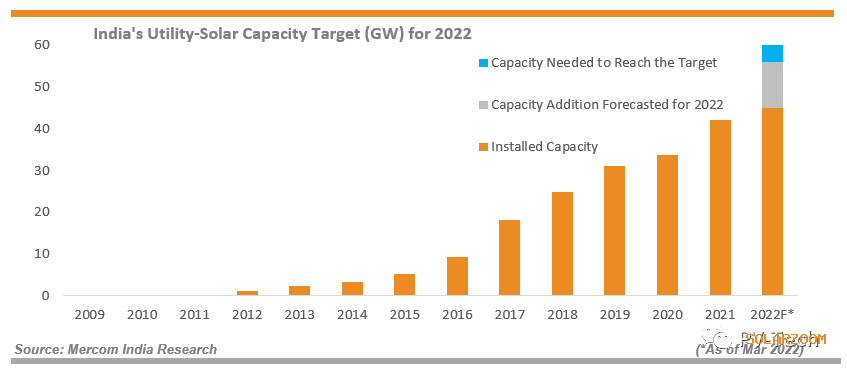 根據(jù)Mercom的印度太陽(yáng)能項(xiàng)目跟蹤報(bào)告,到目前為止,印度已經(jīng)安裝了45.6GW大型地面太陽(yáng)能項(xiàng)目,距離政府設(shè)定的2022年60GW的目標(biāo)還差14.4GW。