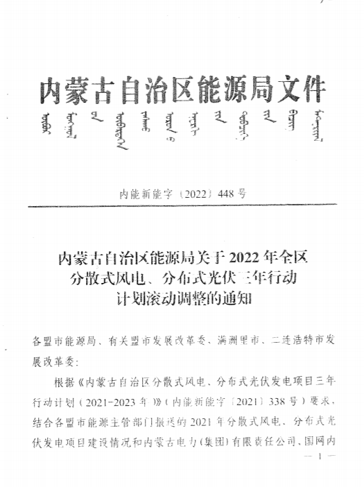 近日,內(nèi)蒙古自治區(qū)能源局發(fā)布《關(guān)于2022年全區(qū)分散式風(fēng)電、分布式光伏三年行動(dòng)計(jì)劃滾動(dòng)調(diào)整的通知》,提出: