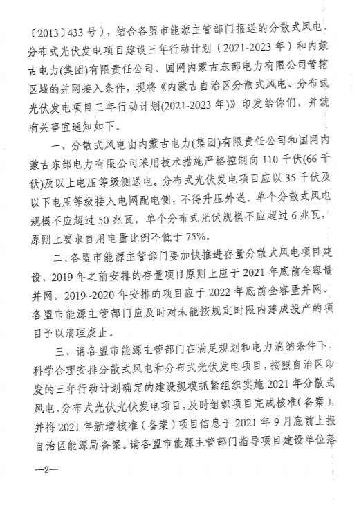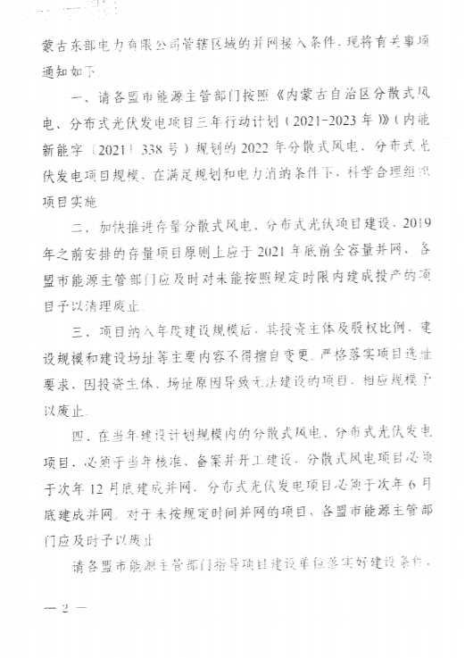 1)加快推進(jìn)存量分散式風(fēng)電、分布式光伏項(xiàng)目建設(shè)、2019年之前安排的存量項(xiàng)目原則上應(yīng)用2021年底前全容量并網(wǎng)、各盟市能源主管部門應(yīng)及時(shí)對(duì)未能按照規(guī)定時(shí)限內(nèi)建成投產(chǎn)的項(xiàng)目予以清理廢止。