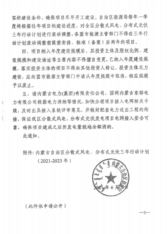 3)在當(dāng)年建設(shè)計(jì)劃規(guī)模內(nèi)的分散式風(fēng)電、分布式光伏發(fā)電項(xiàng)目必須于當(dāng)年核準(zhǔn)、備案并開工建設(shè),分散式風(fēng)電項(xiàng)目必須于次年12月底建成并網(wǎng),分布式光伏發(fā)電項(xiàng)目必須于次年6月底建成并網(wǎng),對(duì)于未按規(guī)定時(shí)間并網(wǎng)的項(xiàng)目,各盟市能源主管部門應(yīng)即使予以廢止。