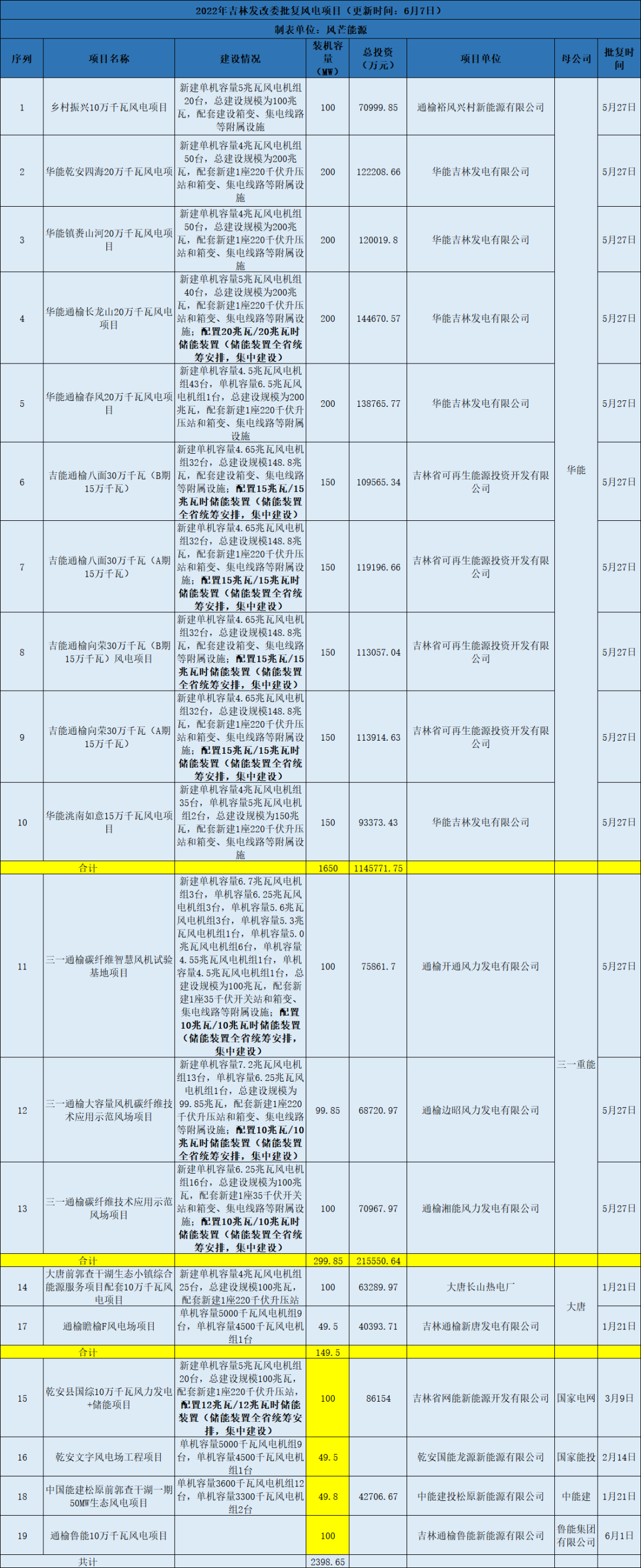 風(fēng)芒能源據(jù)公開信息不完全統(tǒng)計(jì),今年以來(lái)截至目前,吉林省發(fā)改委共核準(zhǔn)19個(gè)風(fēng)電項(xiàng)目合計(jì)2.398GW。