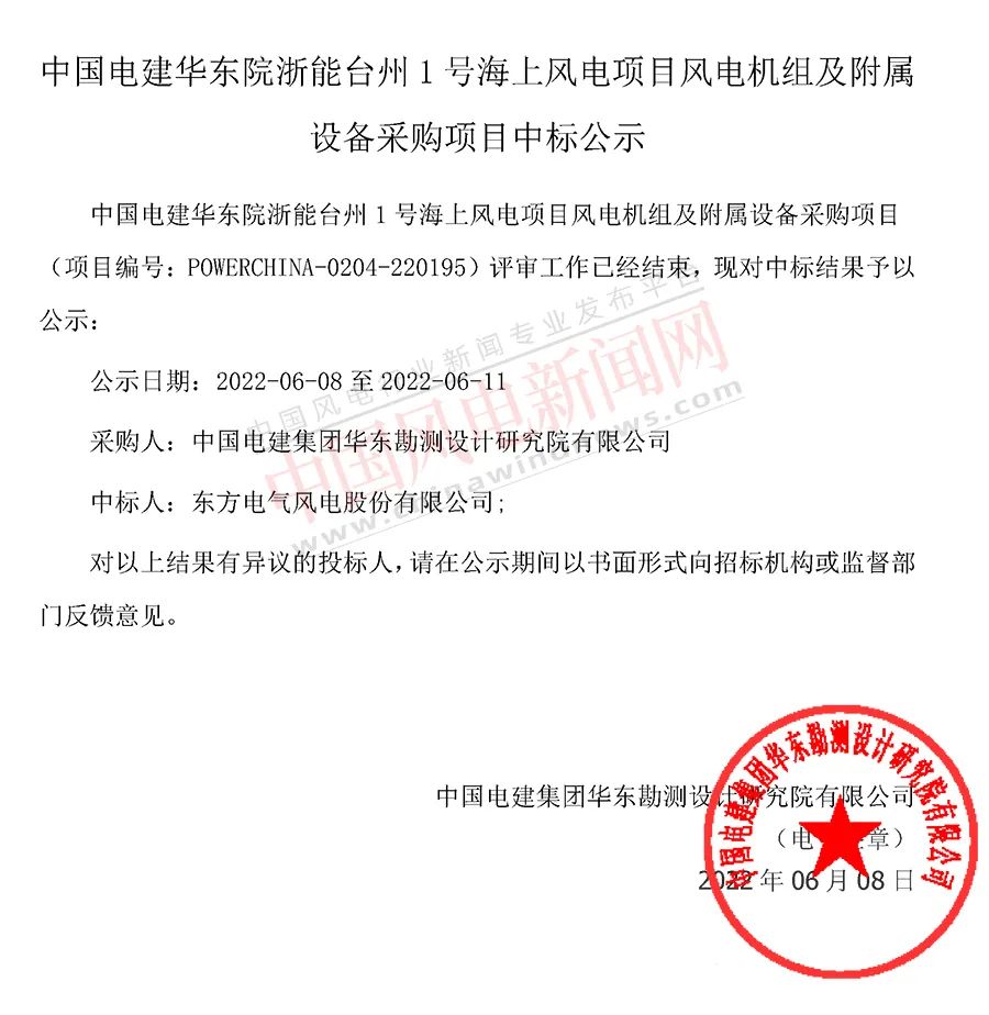 中國風電新聞網(wǎng)訊:6月9日,浙能臺州1號海上風電項目風電機組及附屬設備采購項目入圍公示,規(guī)模共計300MW,東方風電中標!