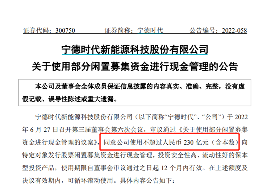 6月27日晚,寧德時(shí)代發(fā)布公告稱,根據(jù)公司當(dāng)前的資金使用狀況、募集資金投資項(xiàng)目建設(shè)進(jìn)度并考慮保持充足的流動(dòng)性,公司擬使用不超過人民幣230億元(含本數(shù))向特定對象發(fā)行股票閑置募集資金進(jìn)行現(xiàn)金管理,使用期限自本議案審議通過之日起12個(gè)月內(nèi)有效。