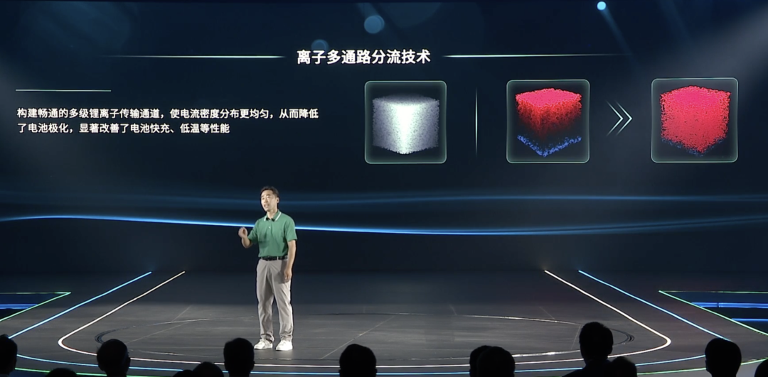 離子多通路分流技術(shù)構(gòu)建了通暢的多級(jí)鋰離子傳輸通道,使電流密度分布更均勻,從而降低了電池極化,顯著改善了電池快充、低溫性能。