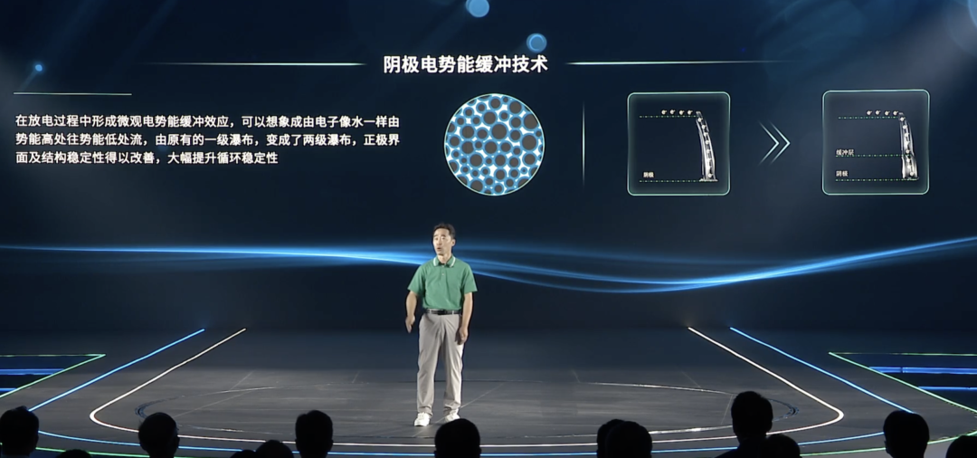 陰極電勢(shì)能緩沖技術(shù)則可以在放電過程中形成微觀電勢(shì)能緩沖效應(yīng),電子像水一樣由勢(shì)能高處往勢(shì)能低處流,由原來的一級(jí)瀑布變成兩級(jí)瀑布,正極界面及結(jié)構(gòu)穩(wěn)定性得到改善,大幅提升循環(huán)穩(wěn)定性。