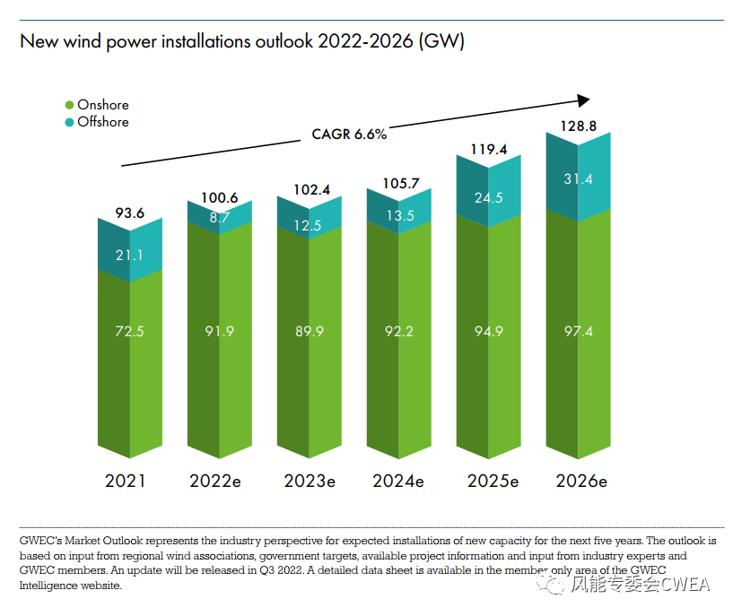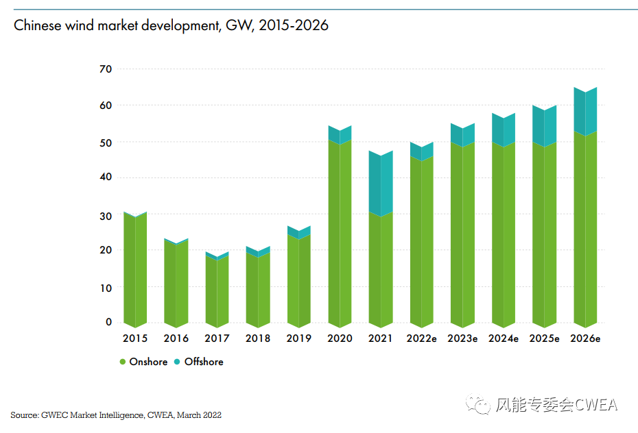 GWEC預(yù)測(cè)數(shù)據(jù)顯示,到2026年中國(guó)風(fēng)電年新增裝機(jī)將超過(guò)60GW,其中陸上風(fēng)電超過(guò)50GW,海上風(fēng)電超過(guò)10GW。