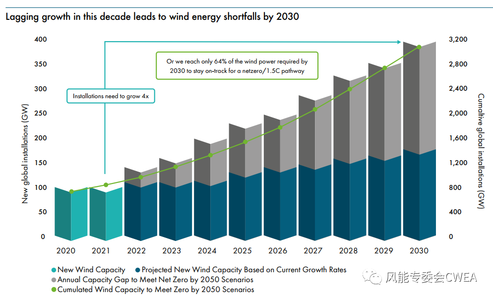 實(shí)際上按照當(dāng)前6.6%~7%的年均復(fù)合增速,各國(guó)裝機(jī)規(guī)模只能達(dá)到2030年階段性風(fēng)電裝機(jī)目標(biāo)的2/3,距離2050目標(biāo)則更為遙遠(yuǎn)。而根據(jù)預(yù)測(cè)數(shù)據(jù),2022-2030年的理想年均復(fù)合增速至少要保持在17.5%以上。