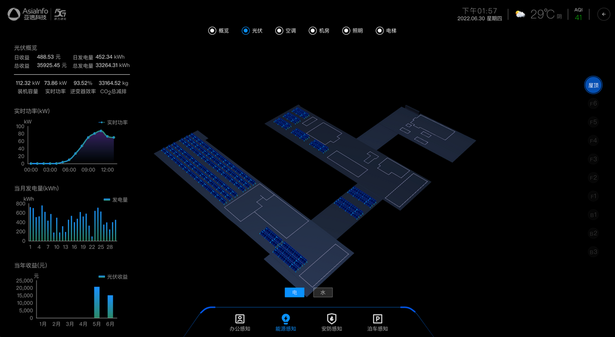 走進(jìn)亞信大廈,綜合能源智慧管控平臺(tái)上清晰地顯示著大樓內(nèi)的用電、用水和屋頂光伏發(fā)電等實(shí)時(shí)數(shù)據(jù)。這就是日前亞信科技正式投產(chǎn)使用的綜合能源智慧管控平臺(tái),實(shí)現(xiàn)了部分用電的清潔替代,以及大廈用能系統(tǒng)的精細(xì)化管理和實(shí)時(shí)監(jiān)控。