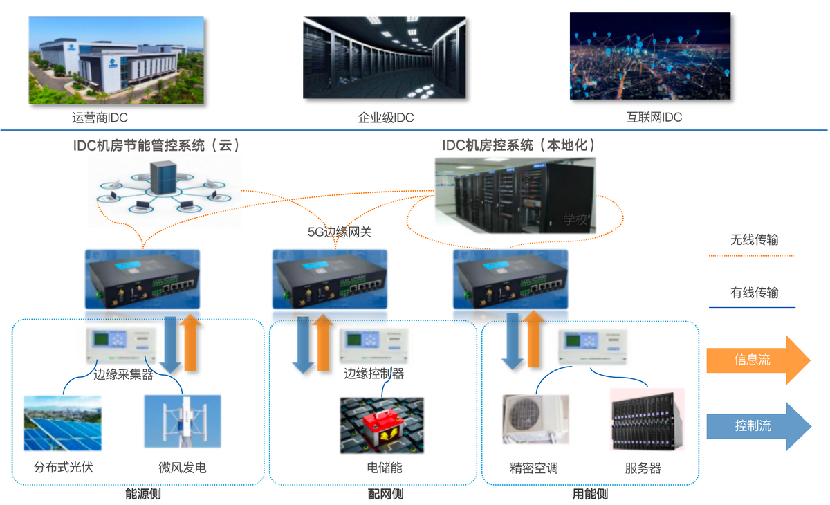 對(duì)于IDC機(jī)房場(chǎng)景,亞信科技攜手各運(yùn)營(yíng)商進(jìn)行IDC機(jī)房零碳綠能改造,以省為單位推進(jìn)項(xiàng)目。在每個(gè)IDC機(jī)房及配套的庫(kù)房、辦公樓屋頂安裝太陽(yáng)能光伏為數(shù)據(jù)中心供電,利用邊緣計(jì)算、5G、AI等技術(shù)將所有運(yùn)行數(shù)據(jù)和設(shè)備運(yùn)行狀況上傳至IDC機(jī)房節(jié)能管控系統(tǒng)云上,實(shí)現(xiàn)一個(gè)平臺(tái)集中控制。
