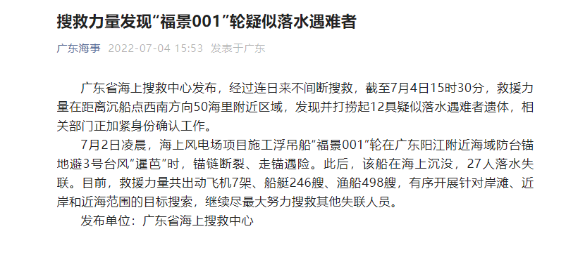 7月2日凌晨,海上風(fēng)電場(chǎng)項(xiàng)目施工浮吊船“福景001”輪在廣東陽江附近海域防臺(tái)錨地避3號(hào)臺(tái)風(fēng)“暹芭”時(shí),錨鏈斷裂、走錨遇險(xiǎn)。此后,該船在海上沉沒,27人落水失聯(lián)。目前,救援力量共出動(dòng)飛機(jī)7架、船艇246艘、漁船498艘,有序開展針對(duì)岸灘、近岸和近海范圍的目標(biāo)搜索,繼續(xù)盡最大努力搜救其他失聯(lián)人員。