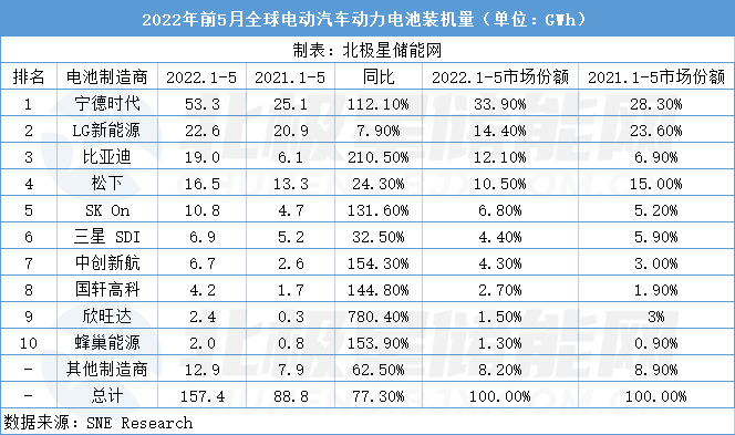 從廠商排名上看,2022年前5月,寧德時代以33.9%的市場份額排名第一,電池裝車總量為53.3GWh;年增112.1%; LG Energy Solutions以22.6GWh的裝車總量排名第二,年增7.9%;排名第三的是比亞迪,裝車總量為19.0 GWh,年增210.5%。其次是松下、SK On和三星SDI,裝車總量分別為16.5GWh、10.8GWh 和 6.9GWh。此外,中國電池企業(yè)在Top10榜單中占據(jù)6席。