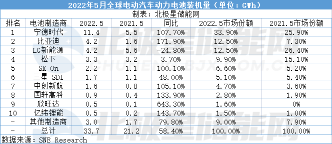 北極星儲能網(wǎng)獲悉,7月4日,韓國市場研究機(jī)構(gòu)SNE Research公布數(shù)據(jù),2022年5月,全球電動汽車電池裝機(jī)量達(dá)33.7GWh,同比增長58.4%,連續(xù)23個月保持穩(wěn)定增長。