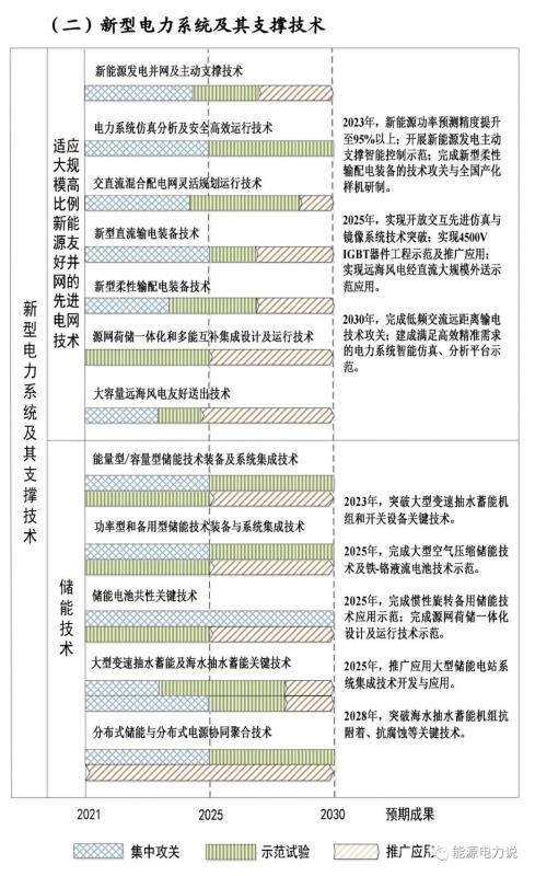 4月2日,國家能源局、科學(xué)技術(shù)部印發(fā)《“十四五”能源領(lǐng)域科技創(chuàng)新規(guī)劃》?!兑?guī)劃》發(fā)布了先進可再生能源發(fā)電及綜合利用技術(shù)、新型電力系統(tǒng)及其支撐技術(shù)、能源系統(tǒng)數(shù)字化智能化技術(shù)等5大技術(shù)路線圖。其中在新型電力系統(tǒng)技術(shù)路線圖中,也公布儲能技術(shù)路線圖,“十四五”儲能技術(shù)創(chuàng)新包括: