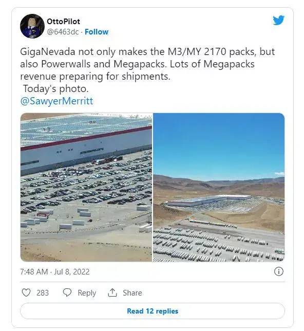 一位名叫OttoPilot的Twitter用戶(hù)操作無(wú)人機(jī)飛過(guò)內(nèi)華達(dá)州Gigafactory,在工廠外發(fā)現(xiàn)了數(shù)量驚人的特斯拉Megapack。