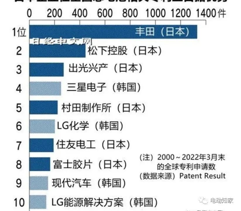據(jù)悉,這項(xiàng)研究調(diào)查了從2000年到3月底來自10個(gè)國家和地區(qū)的申請(qǐng),在世界全固態(tài)電池相關(guān)的專利數(shù)方面,日本公司在開發(fā)下一代電動(dòng)汽車電源的競賽中占據(jù)主導(dǎo)地位:排在首位的是豐田汽車(Toyota Motor),擁有1331項(xiàng)已知專利,是第2名專利數(shù)的3倍;第2位是松下控股(HD),擁有445項(xiàng)專利;第3位是出光興產(chǎn),擁有272項(xiàng)。在前5家企業(yè)中,4家是日本企業(yè),排名第四的三星電子是唯一一家進(jìn)入前五名的非日本公司。。