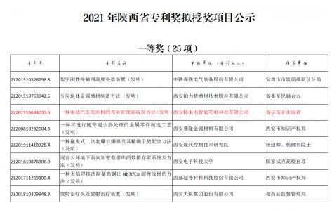 近日,2021年度陜西省專利獎擬授獎項目已公示。西安特來電智能充電科技有限公司發(fā)明專利“一種電動汽車充電機的充電管理系統(tǒng)及方法”榮獲2021年陜西省專利獎一等獎。