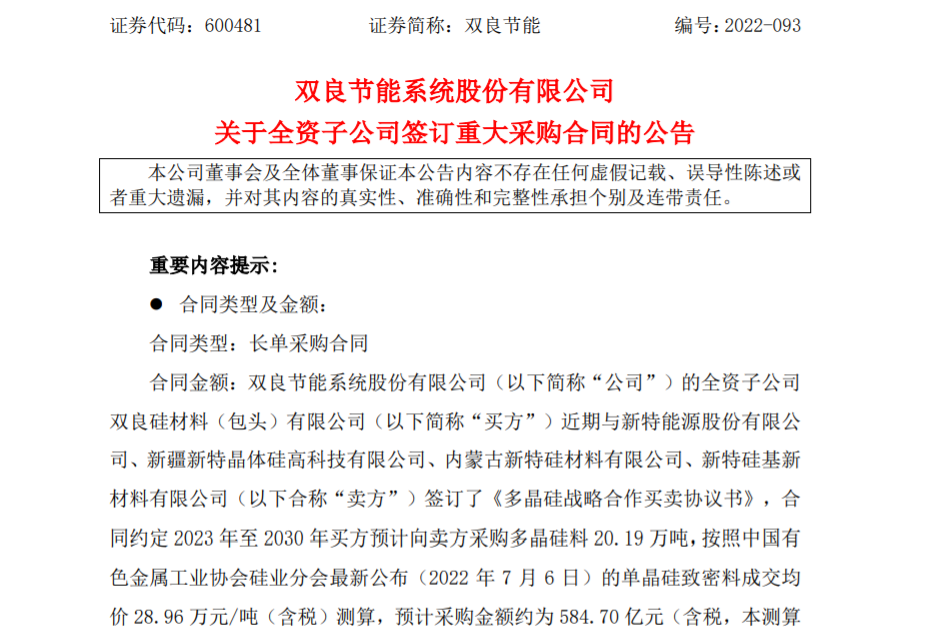 7月12日,雙良節(jié)能(SH:600481)發(fā)布公告,公司全資子公司雙良硅材料(包頭)有限公司近期與新特能源(HK:01799)及其三家子公司簽訂了《多晶硅戰(zhàn)略合作買賣協(xié)議書》,合同約定2023 -2030年間,雙良節(jié)能預計向新特能源采購多晶硅料20.19萬噸,預計采購金額約為584.70億元(含稅,本測算價格不構成價格承諾)。
