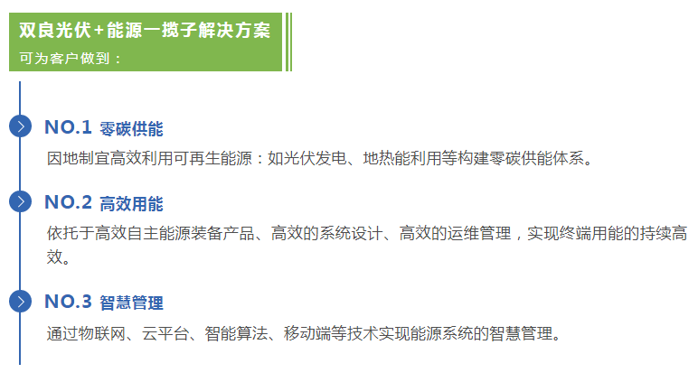 雙良智慧能源于今年正式成立光伏+事業(yè)部,并結(jié)合“供能端零碳技術(shù)”和“用能端減碳技術(shù)”的技術(shù)路線,整合自身傳統(tǒng)業(yè)務(wù)優(yōu)勢,提出"一光兩化三管理"的光伏+綜合解決方案,即分布式光伏電站一站式 EPC 總包服務(wù)+數(shù)字化+電氣化,并在數(shù)據(jù)終端實現(xiàn)碳管理、能效管理、智慧運維管理,助力客戶降低能源費用、提高能源保障能力、降低碳排放及助力綠色示范創(chuàng)建。