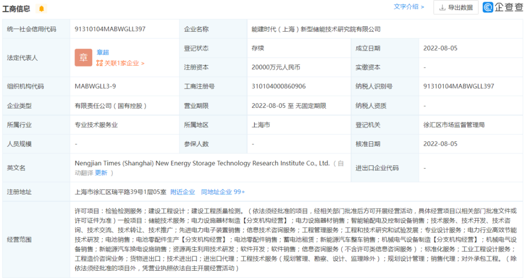 導(dǎo)讀:8月5日,能建時代(上海)新型儲能技術(shù)研究院有限公司成立,法定代表人為章超,注冊資本2億元人民幣。該公司經(jīng)營范圍包含儲能技術(shù)服務(wù)、電池銷售、電池零配件生產(chǎn)/銷售、蓄電池租賃、新能源汽車、新能源汽車換電設(shè)施銷售等。