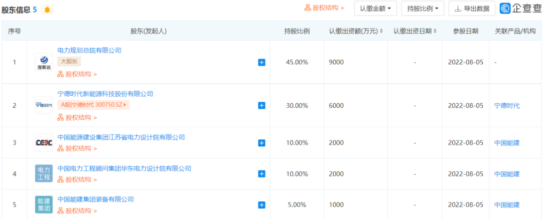 企查查股權(quán)穿透顯示,該公司由電力規(guī)劃總院有限公司持股45%、寧德時代新能源科技股份有限公司持股30%、中國能源建設(shè)集團(tuán)江蘇省電力設(shè)計院有限公司持股10%、中國電力工程顧問集團(tuán)華東電力設(shè)計院有限公司持股10%、中國能建集團(tuán)裝備有限公司持股5%。