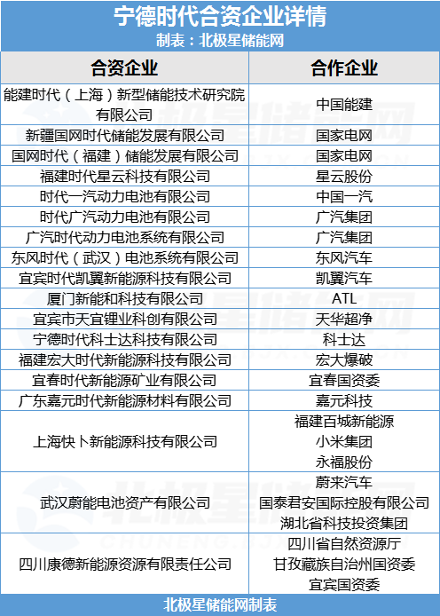 據(jù)北極星儲能網(wǎng)不完全統(tǒng)計,此前,寧德時代與國家電網(wǎng)、星云股份、中國一汽、廣汽集團(tuán)、科士達(dá)等21家企業(yè)及單位合資成立15公司,具體詳情如下: